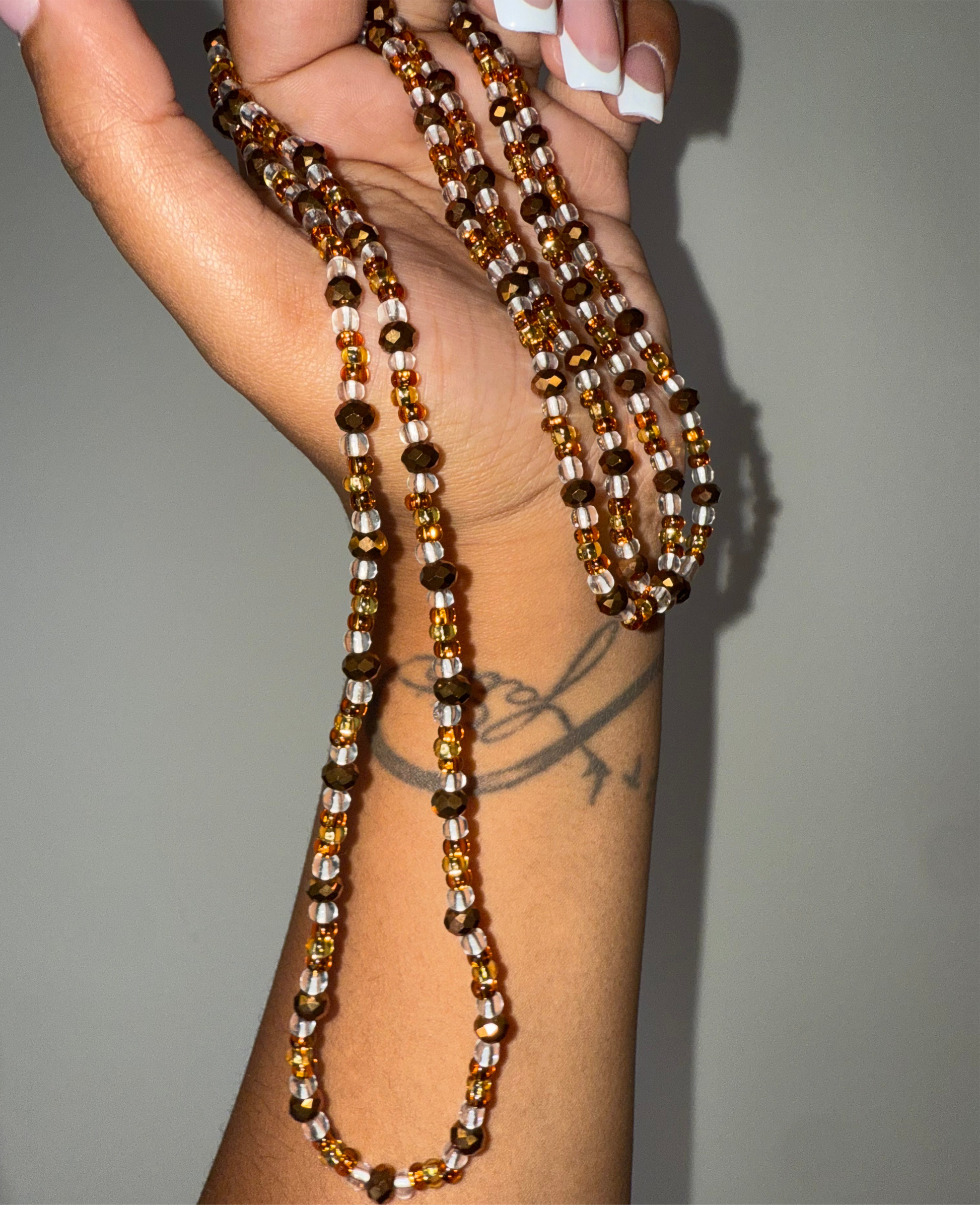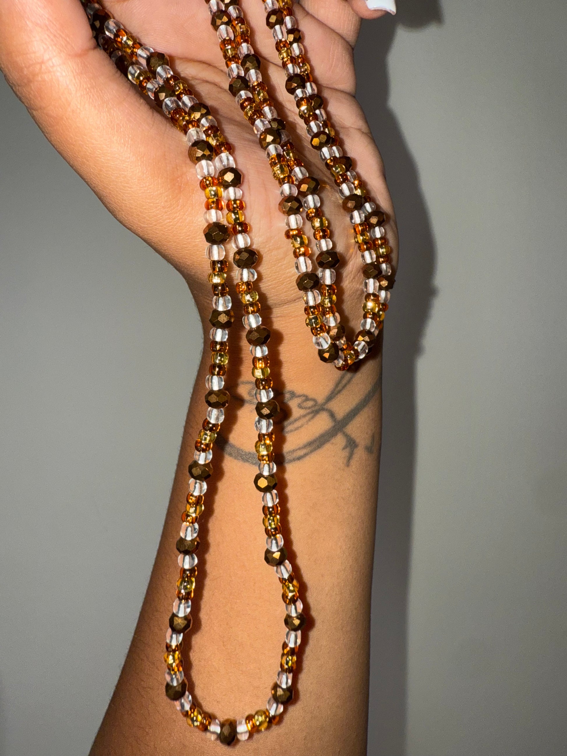 Waistbeads strung on thread about 52in long. Made with gold, bronze, and clear seed beads with bronze gold crystals. If you need a size larger than 52inches, please send an email to beautifullywaistedbabe@gmail.com with your name, order number, phone number, and the size you need in INCHES. You will receive a response within 24hrs. ALL SIZES are serviced.